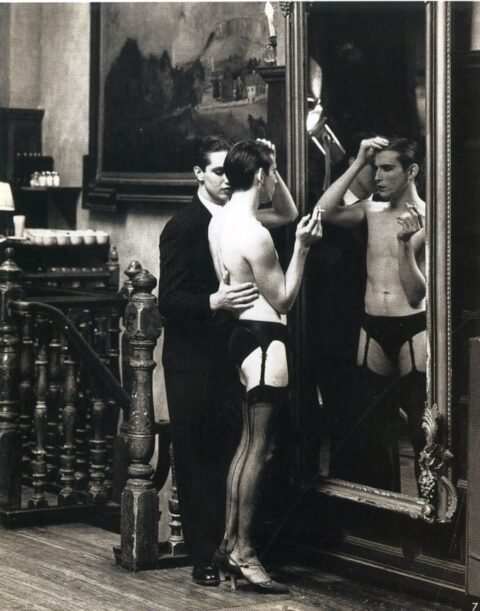 “This shot was part of a story we did with madonna. The guy in the mirror is Andrew Richardson, who was an assistant stylist. Another picture I took of him eventually ended up on the cover of Italian Vogue, but he was never really a model. I shot him from time to time, and I think he posed for me just for fun, or maybe to meet madonna! Next to him is Mars, a circus performer from Russia. He walked the tightrope.”- Steven Meisel