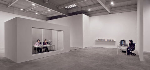 “right now at David Zwirner Gallery, you can dip into one of the weirder artistic rivers of the last 40 years and behold—or participate in—on kawara’s mad epic sculpture–performance One Million Years. the japanese-born, new york–based artist’s rarely seen work is centered around a desk and two chairs in a windowed booth at the center of the otherwise almost empty zwirner gallery. during business hours, two volunteers sit inside the room. one man and one woman take turns reading progressive dates going one million years into the future or into the past. several fridays ago, i spent an hour reading the 875 years between a.d. 38,658 and a.d. 39,533. it was one of the odder hours i’ve ever spent in a gallery.” JS for New York. by dd