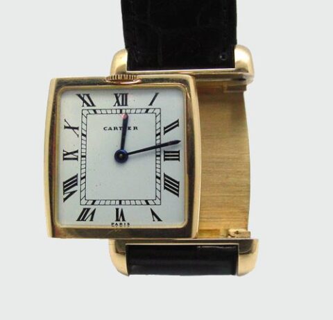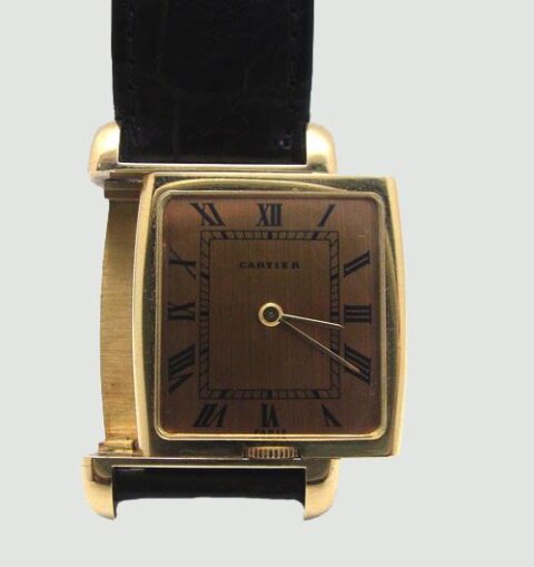 a beautiful very rare mechanical cartier reverso dual time zone from the late 1970’s. I’d take this over the original jaeger le coultre version for its rarity… anyday. beautiful half-moon shaped lugs. one side has a white dial with black roman numbers. the other side has a champagne dial with black roman numbers. look closely the crowns are hidden on the top and bottom of the body of the watch. both movements are “manual wind” movements. if you come across one it would be around +17K and probably a lucky find by dd