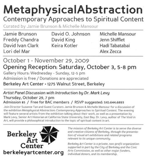 contemporary approaches to spiritual content, curated by jamie brunson & michelle mansour october 1 – november 29, 2009 at the berkeley art center. admission $5. featured work by jamie brunson, david ivan clark, david king, hadi tabatabai, alex zecca and more. by xy