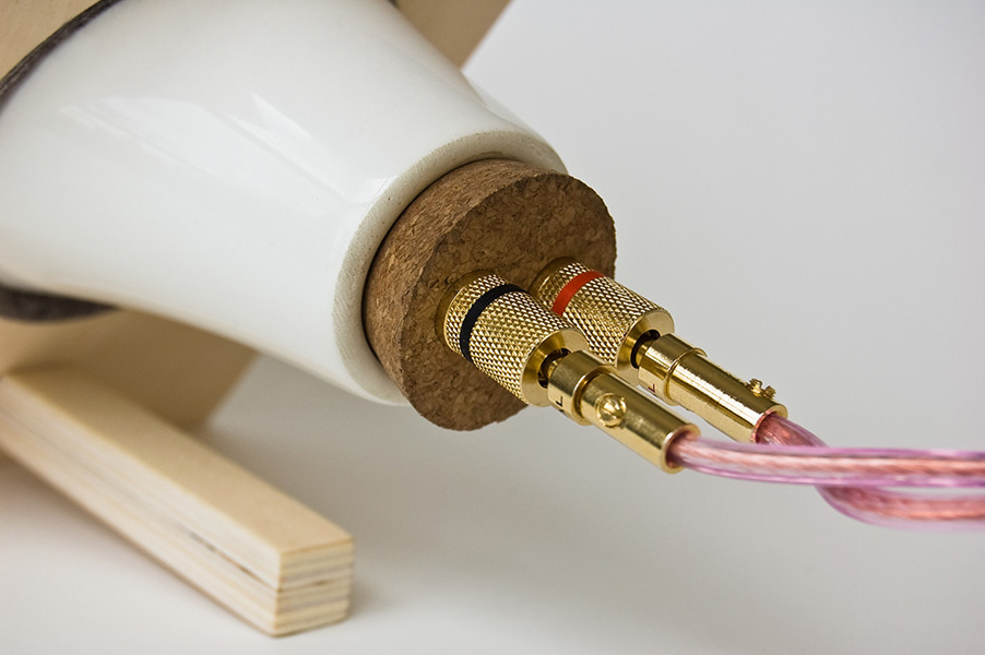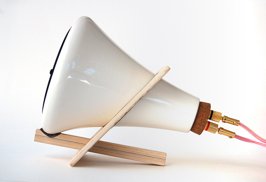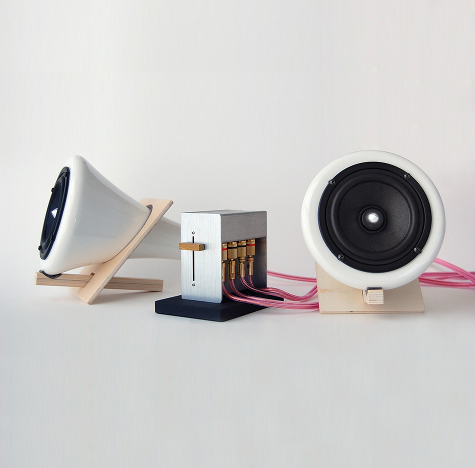 “the ceramic speakers are made from porcelain, cork, and baltic birch. each material is minimally finished, left to add its natural beauty to the design. the included amplifier is made from stainless steel sheet metal, with a cast iron base and paulownia volume slider. aside from the electronic components, plastic is completely avoided in the system’s construction. typical speakers are designed to play even the most compressed or poorly recorded track. they gloss over the details that give high-resolution music its depth. the ceramic speakers’ custom-made drivers, porcelain and cork enclosures, and tripath amplifier reveal every nuance. they will show the difference between lossless and mp3 files, and will unlock vinyl’s richness.” available december 2009 priced under $500 by pp + dd