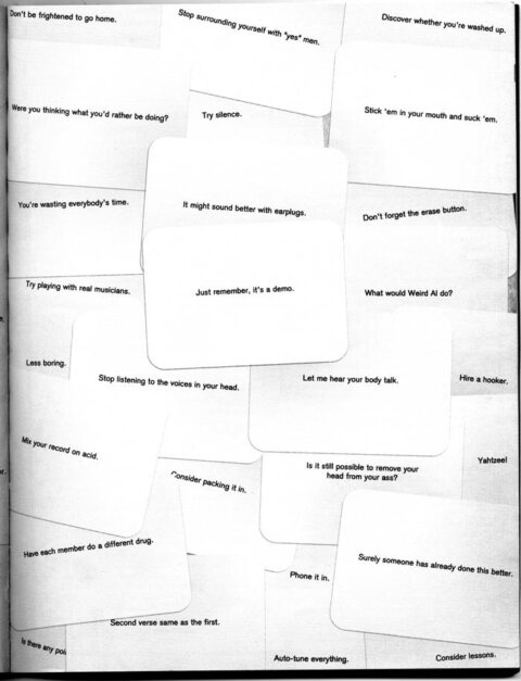 “the deck itself had its origins in the discovery by brian eno that both he and his friend peter schmidt tended to keep a set of basic working principles which guided them through the kinds of moments of pressure – either working through a heavy painting session or watching the clock tick while you’re running up a big buck studio bill. both schmidt and eno realized that the pressures of time tended to steer them away from the ways of thinking they found most productive when the pressure was off. the strategies were, then, a way to remind themselves of those habits of thinking – to jog the mind.”