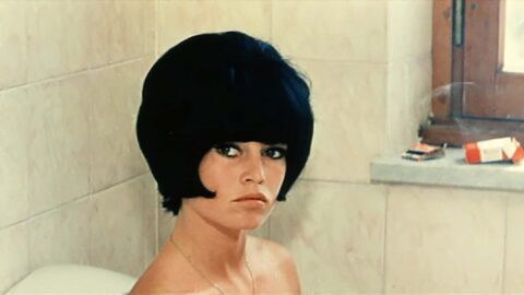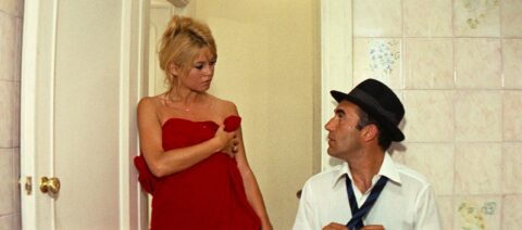 brigitte bardot plays camille javal, the disaffected antonioni heroine of l’avventura. they are linked by a crucial scene, that godard quotes later in the film, where monica vitti in antonioni’s film puts on a wig in front of her best friend, that she suddenly comes to resemble – a friend who will soon disappear, suggesting some form of metaphysical transference has taken place. camille’s husband paul (michele piccoli) wears a hat that links him to the american school of cinema, via dean martin’s role in some came running (1958), name checked by paul himself. already their cinematic personas – conferred by their headdress – hint at irreconcilable differences. this is a recurring motif in godard’s work from his first feature a bout de souffle, where, as godard explained himself, jean-paul belmondo’s character was based on the the crime/noir school of american cinema including the harder the fall (seen in poster form) and jean seberg’s character came from a previous film with otto preminger, bonjour tristesse.