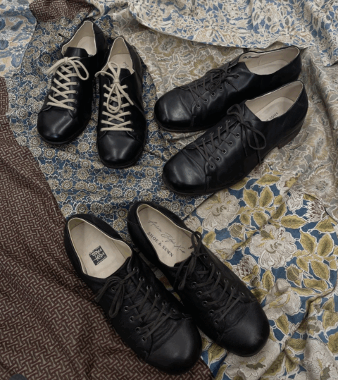 2023 footwear collaboration with shoe & sewn x aviva jifei xue- ‘brooklyn’ models in brown washed lamb leather and black buffalo leather